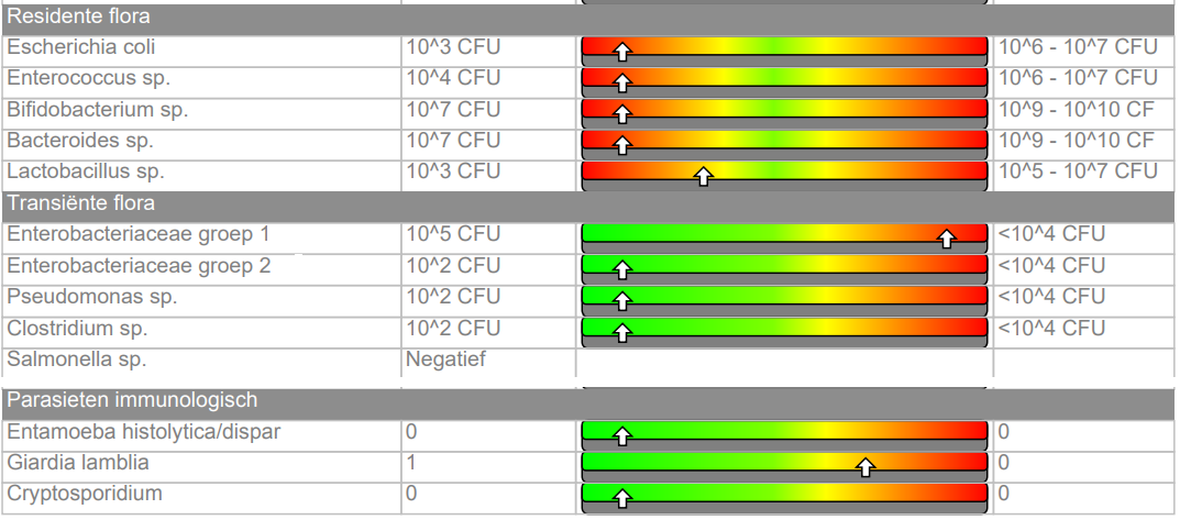 Erg belangrijk is de lage aanwezigheid van zijn residenten (gezonde en vriendelijke) darmbacteriën. Deze bieden normaal beschermen en zorgen voor een goede stoelgang, goed afweersysteem, aanmaak van gelukshormonen en productie van energie. Daarnaast zien we daaronder een flinke belasting van transiënte bacteriën (enterobacteriaceae groep 1) wat zorgt voor overmatige productie van ontstekingen en kan lijden tot huid of allergieklachten. Ook is er een parasieten belasting gemeten. Deze overbelasting kan leiden tot huidklachten, ontstekingen maar ook vooral opgeblazenheid, winderigheid en darmklachten. Bij een overgroei van belastende bacteriën of parasieten zal je gezonde darmbacteriën in de loop van de tijd afnemen en minder beschermingen kunnen bieden.